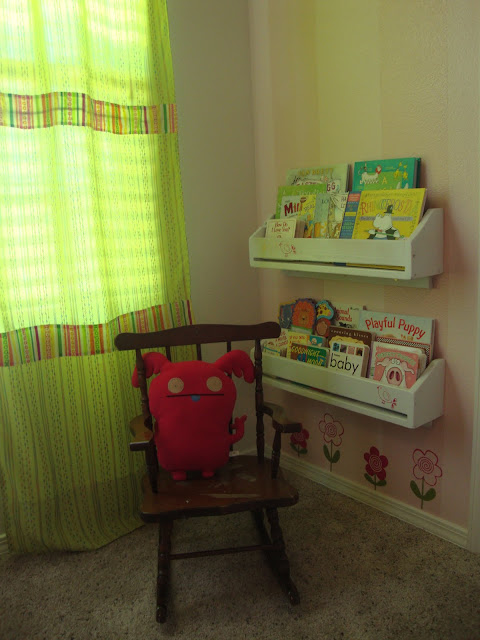 I also brought my rocking chair from when I was little girl over from my parents house and it goes perfectly in the corner for her to sit and read in. (I still need to do something to it to get rid of the stickers I put on the seat as a child.)