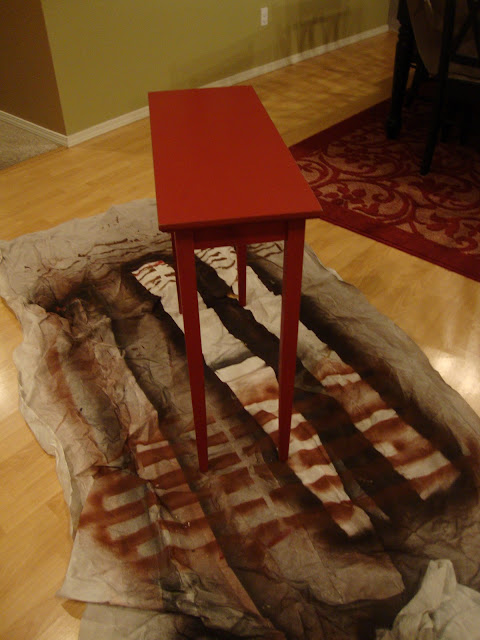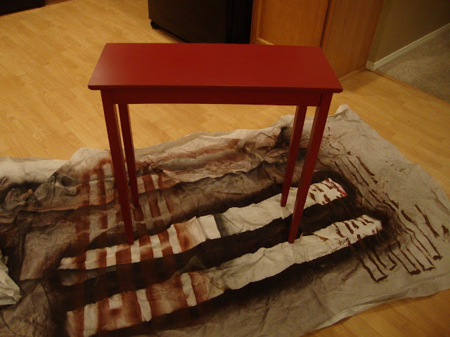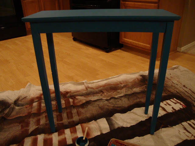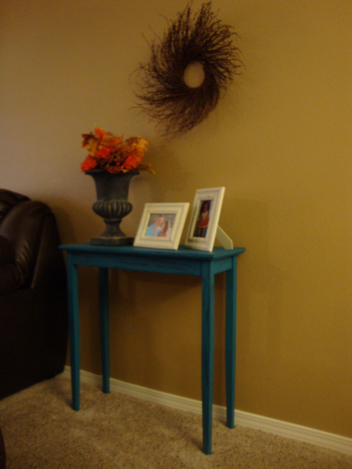 This table has been with us for most of our marriage. I always decorate with red, so it has been perfect for our house. It has been used as an entry table, side table and a basic display table. When I decided to re-do our front room, however, I decided that the turquoise from the plaid pillow would be a perfect color to paint the table and bring a little more cohesion to the room.