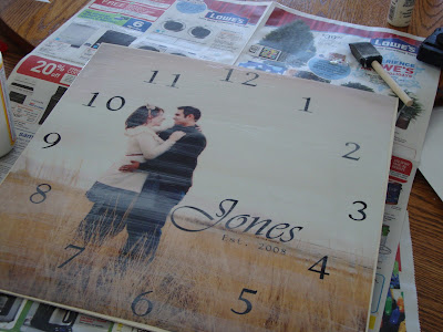 To edit the pictures I used photoshop CS4. I simply uploaded a picture file and pasted it into a ‘new’ image that was sized to 16×16 inches and 300 ppi. I also uploaded a template of a clock and used it as a pattern to make sure that I was placing my numbers or markers in the right places. I added some words to the image, and some brush strokes of florals for mine and Jonie’s sister. I wanted to keep them pretty simple, but you can use textures if you want as well that also add some flare. This can all be done on photoshop elements as well, and if you don’t have photoshop, I hear Picnik.com is a great photo editing site. And if you just want to bag that all together, then I would reccomend just sending a favorite picture to Sams or Cosco (they will do a 12×12) and cropping it onto your board. Then you can use vinyl, stickers, or a stencil for the numbers and name. Some clock kits even come with numbers as well.