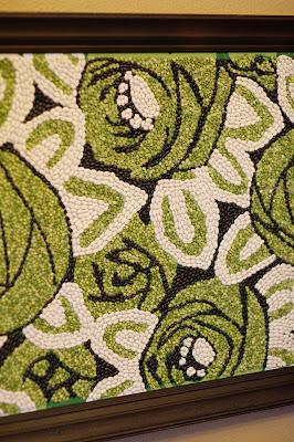 My mom made them for me and it really can be made by anyone.  You will need to get some frames from the thrift store, some of your favorite prints and some beans.  I made color copies of the art so that I wasn’t using the originals, then my mom glued the prints in the middle of the frames.  Next make a border around the art using any sort of color of bean you want and in any pattern.  It really is so easy and it looks great!  I have these in my kitchen which is the perfect spot for such a tactile, organic piece of art.