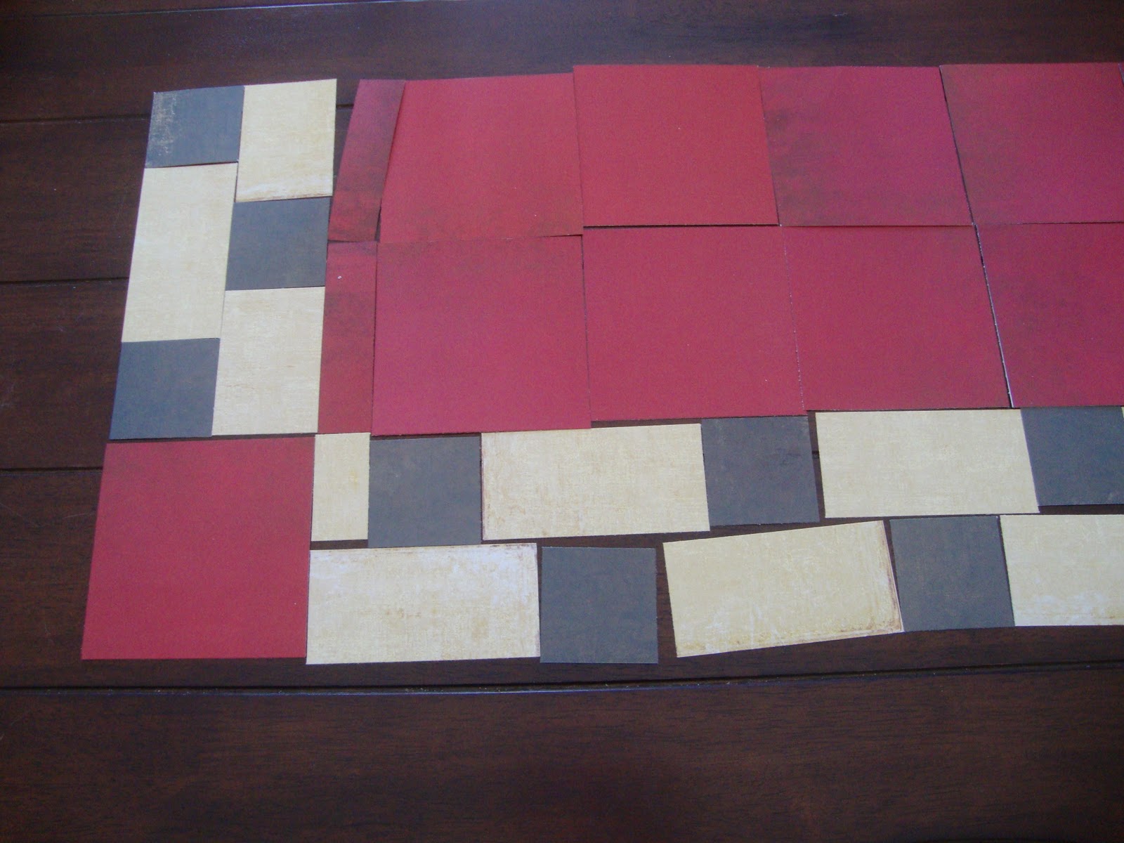 Next, I cut out all of the tiles. Behind the stove, the cream tiles were 2X4 inches, the gray tiles were 2X2 inches and the red tiles were 4X4 inches. The tiles above the counter were just the standard 12X12 scrapbook paper size.