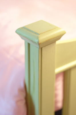 This happened quite by accident, but trying to get the bed in the room caused some of the paint to rub off/chip off.  So I decided that instead of re-painting, the bed would become a shabby sheek bed and I am glad I did.  It really added a lot to the bed and I love the result.  I sanded a couple of other parts to make it all look like it worked.