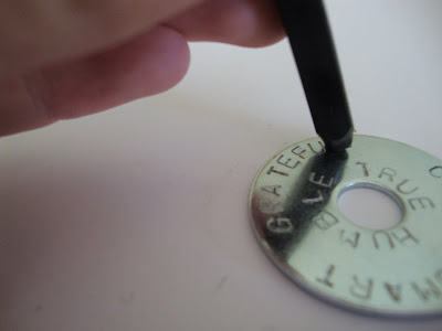 To begin, you will need to have a solid surface (as in concrete solid.)  I found that my garage floor or the sidewalk worked the very best.  One by one, using the stamping set, you hammer each letter into place.