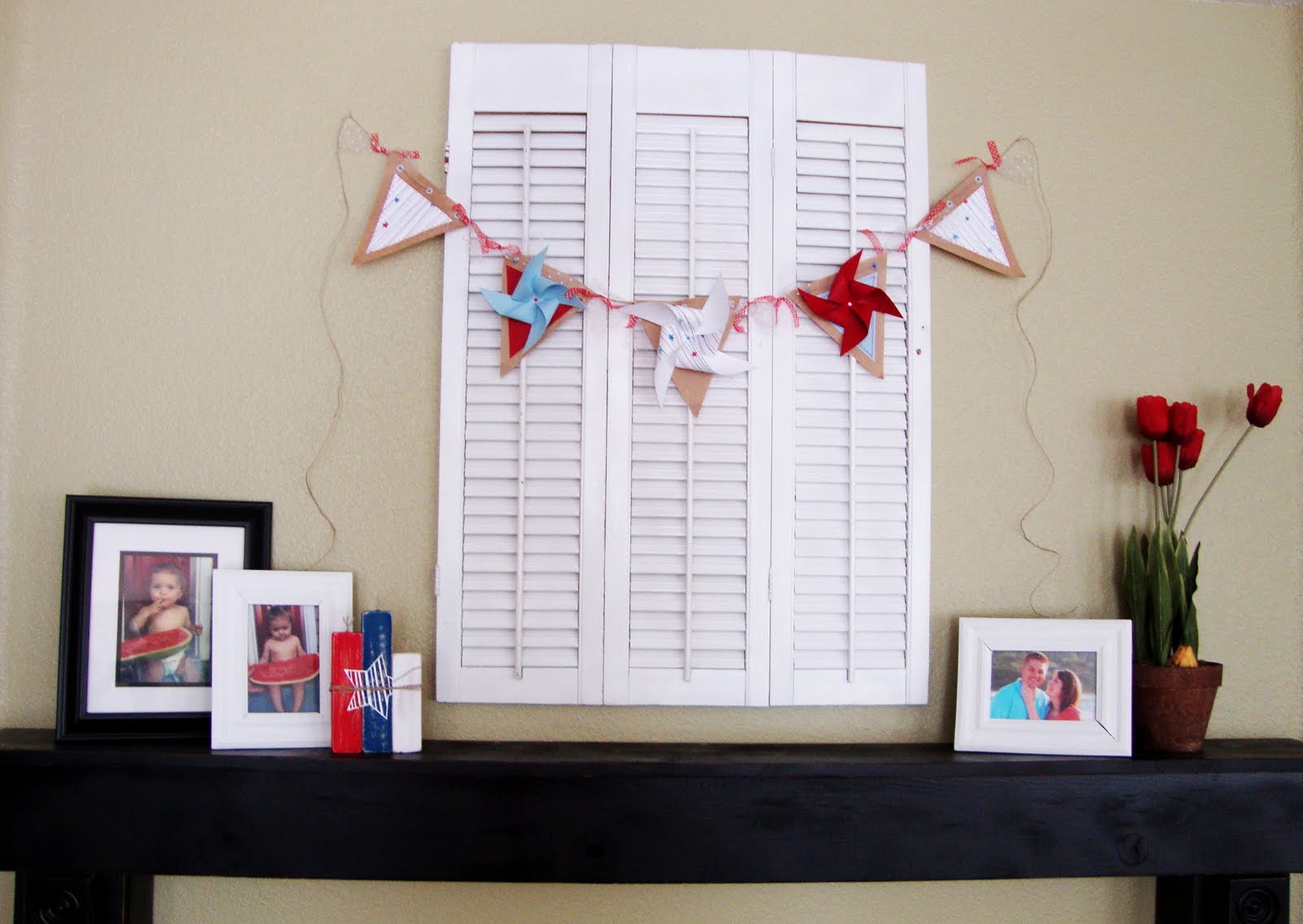 The pennant is really cute and I especially love the addition of the pinwheels! Your firecrackers are adorable too. Beautiful mantle!