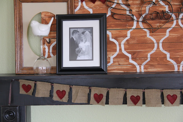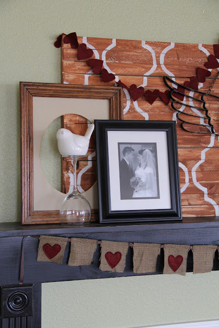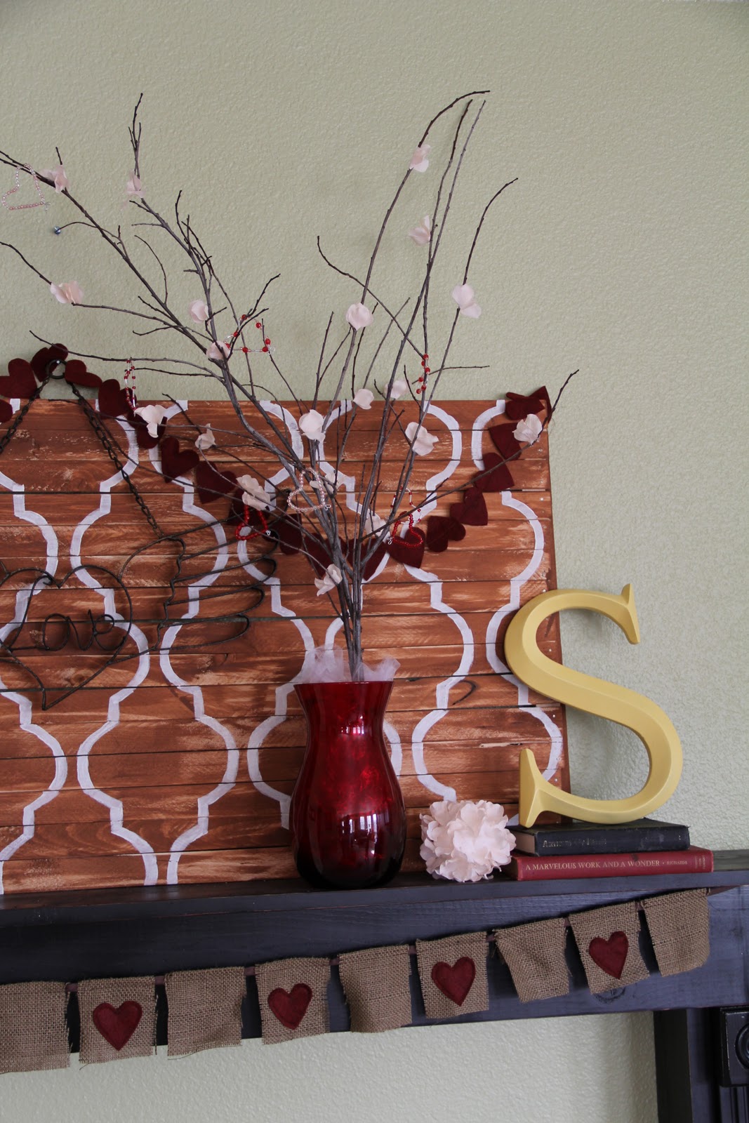 The tree is the thing that I had intended for the right side of my mantel.  I simply took some old tree branches, added some fake blooms onto the branches with a little hot glue, and then I made some cute heart ornaments to hang on the tree.