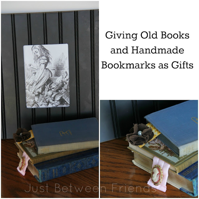 Make a bookmark to personalize and beautify your gift. We found this tutorial for making gorgeous bookmarks out of ribbon and a single earring. You can see our version in the picture below. The cameo is a pin, so we just pinned it to the ribbon. The flower was attached with a glue dot, which holds surprisingly well. I don’t think they are very practical bookmarks for use, but for displaying books, they make a beautiful statement.