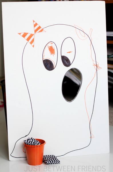 I drew a simple ghost like shape on the board using a pencil, and made the mouth large enough for the bean bags to fit through. I was originally going to cut out the eyes as well to have more then one place to throw the bags through, but the mouth was enough for our purposes.