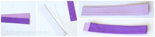 Begin by cutting out your foam into a 1.5″ wide strip by however long your piece of foam is. The longer the foam, the more fun it is! Cut two strips that are exactly the same size by using the first one you cut as a guide for the second piece. Next, cut a piece of wire to be almost the entire length of the foam. You are going to need to roll up one end and don’t want the foam in the way. (we will get to that in just a minute) Once your wire is cut, take off the adhesive backing from the glittery foam and stick the wire to it making sure to spread them apart. Now you are going to take the other piece of foam (the one without the wire on it) and cut a small section off the top. It would be about a half of an inch is all. Attach the foam to the adhesive foam making sure that the foam matches up leaving a section of glittery adhesive foam exposed at the top.