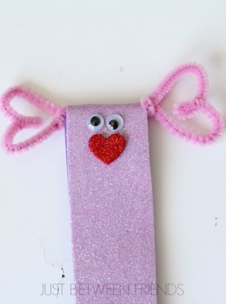 You will need to do this part. I hot glued little eyes on the worms, but let the girls tell me which side was the side they wanted me to put them on. After that, it is all them! Let them go crazy adding heart stickers to their heart’s content.