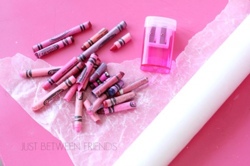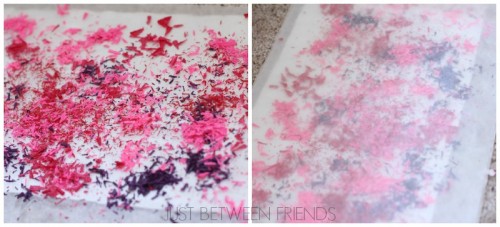 To begin, you will need to take all of the paper off of the crayons.  I decided to go with pink, red and purple for our hearts but you can use any colors you would like!  This is the perfect job for everyone to help with!  My 2 year old went to town pulling off papers and had fun doing it!  After the paper is removed, use the pencil sharpener to make crayon shavings.