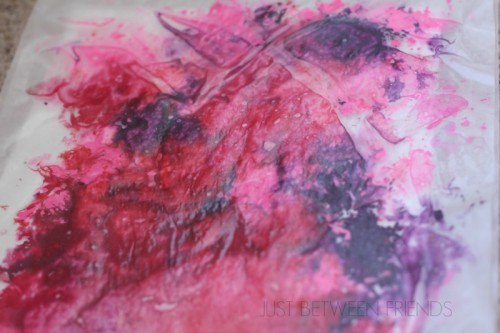 Once you have melted the crayon.  Pull the fabric back and check out your work!  It will only take a little bit for the crayon to harden again leaving you with a stained glass looking piece of wax paper.  Your kids will think it is the coolest thing ever!  I know mine did!