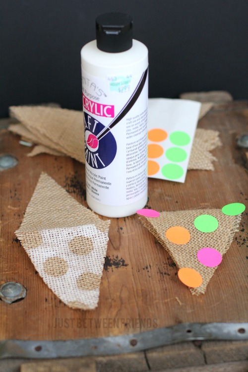 Creating the burlap pennants was really easy as well. I folded the burlap in half and cut out a pennant shape. Then I placed the circle stickers on the burlap and painted the white paint over the top of the stickers. I only did it on the front half of the pennant though, since the back wouldn’t ever be seen. I removed the stickers and was left with a cute polka dot pennant.