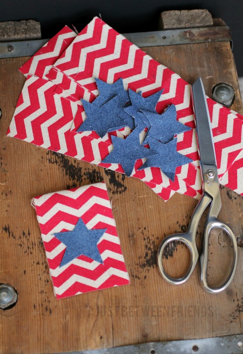 To get started, I cut the ribbon into rectangles so that I could fold it over the rope of the banner. I then drew a star and cut it out of the denim to create my blue stars. This whole banner is “no sew” which means I used hot glue to attach everything. So easy!