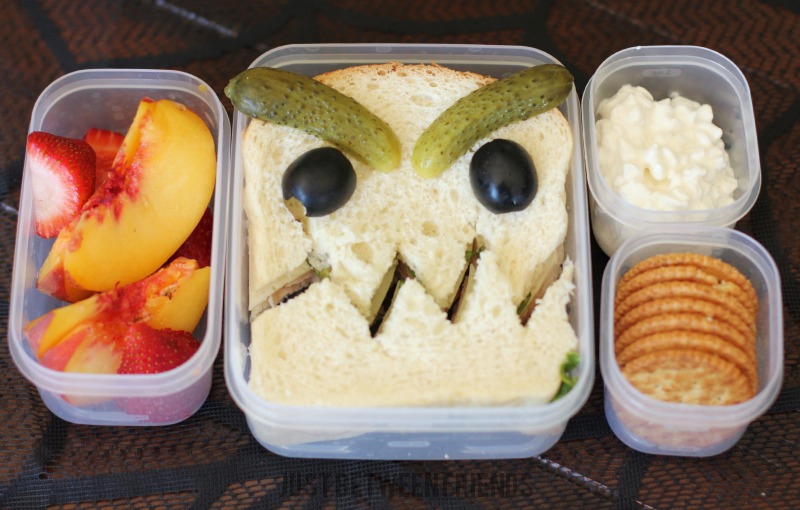 To make this the healthiest possible, you really should use a whole grain bread.  I had an enriched white bread on hand, so that is what we used.  I added turkey, cheese, lettuce and pickles to the sandwich and then once it was put together, I used a steak knife to cut the teeth.  I then grabbed some olives (leftover from our mummy pizzas the day before) and some pickles cut into slices to make the face.