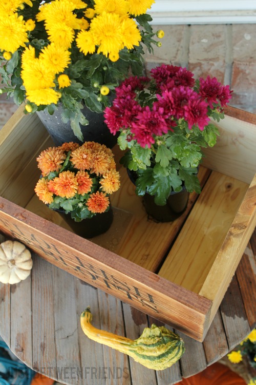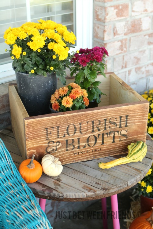 The other day I told my husband that there were specific things that needed to be done before this baby could come. One of those was that I NEEDED my porch to look like fall. I know, it’s totally irrational, but I know that if it doesn’t get done before he is here it will never get done. Anyway, I got to work last week and decided I needed a wooden crate to hold some flowers. This DIY wood crate is the perfect addition to any porch because it isn’t holiday specific. I may have actually started having contractions 6 minutes apart because of this project, but it was TOTALLY worth it! (I have since been banned from using power tools by my dr. Oops. 🙁 )