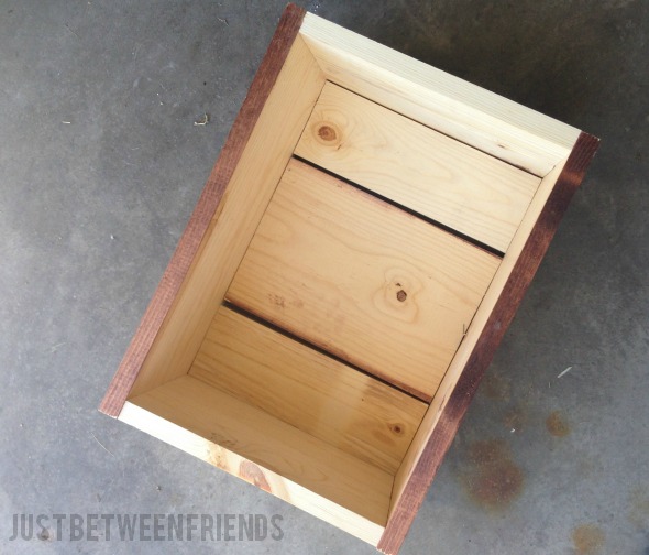 I used my chop saw to cut the wood to size, and then used a staple gun to put the pieces together. If you make a crate like this, remember to leave spaces between the wood in the bottom, or drill holes for drainage purposes. It will help to keep your wood from warping. After it was put together, I used a stain on the wood. The 1X8 turned a darker color than the 1X4 and I LOVE the contrast of the dark and light wood together.