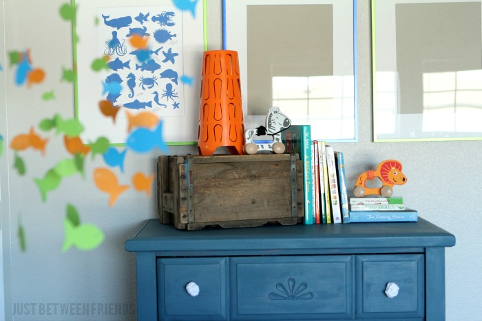 There you have it! A subtle fishing themed dresser that is perfect for the nursery! On top of the dresser, you will find some books, toys, and a lamp. The lamp is from IKEA, toys from Target, and books from all over. Last, the frames up above the dresser are from Michaels and I got them on sale for $4 each!!! You can’t beat that! I will eventually have pics of my baby in the two empty frames. The frame that has the sea creatures in it is a print that my friend made for me that I am in LOVE with. It is perfect for the subtle underwater, fishing theme I am going for.