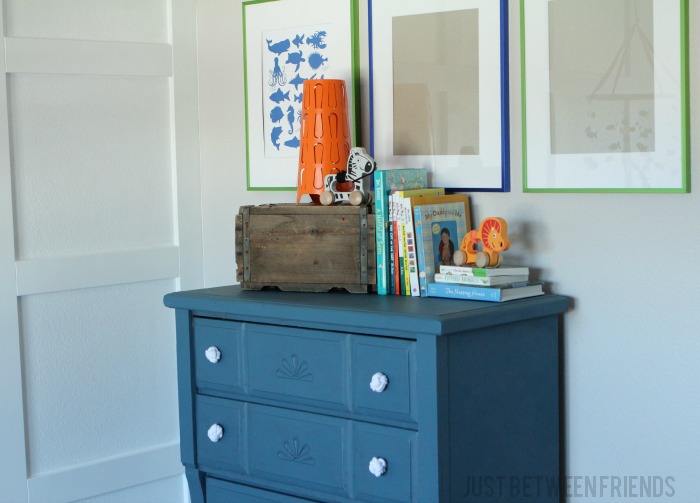 I started with a dresser that I picked up from the thrift store for $45. It is solid wood and just needed some updating. It was PERFECT for the nursery. I wanted to go with a fish theme in the nursery because my husband LOVES fishing. The fishing details are subtle and throughout the room because I didn’t want to overwhelm the space with fish. I brought the dresser home with me and started thinking about how I could finish it to go with the fishing theme. I decided to use Chalk Paint® Decorative Paint by Annie Sloan in the color Aubusson Blue and finished it off with their Clear Soft Wax. I had never used Chalk Paint® before and was excited to give it a try. It is definitely different than any other paint I have ever used. First, I need to clarify that this is NOT chalkboard paint. The Chalk Paint® is a really sticky and thick paint that makes it so that you don’t have to sand or prime your project before you get started. It made the process of painting it super fast and painless!