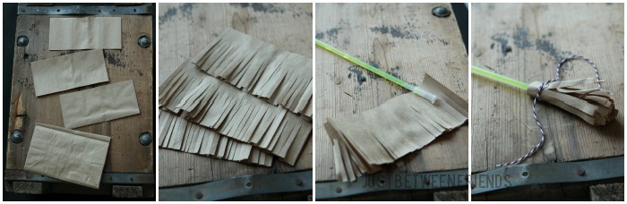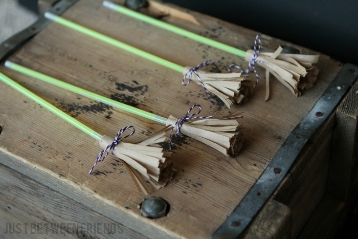 To make the broom part, cut the lunch sack into three parts. Then stack them together and cut vertical strips all along the bottom 3/4. Grab your glow stick, add a connector so that they glow stick can be used as a bracelet, and then wrap the cut lunch bag around the glow stick very carefully so you don’t accidentally activate the glow stick by breaking it. Last, tie it up with the bakers twine and you are good to go! I recommend tying a double knot to secure it first, and then tie a bow for the cute factor. We all know the cute factor is important! Ha!