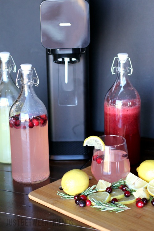 I recently discovered a machine that I am quickly falling in love with! It is called SodaStream and it is so fantastic. Basically, you can make your own carbonated drinks and sodas right at home with way less sugar and calories than a normal soda would have. We have had so much fun playing with the different drinks you can make, and I figured I would share some flavored lemonade with you that we like that would be perfect to serve during the holidays!