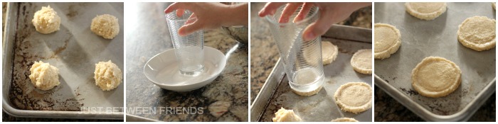 These sugar cookies are so light, fluffy and SO dang GOOD! She started by making the dough and then using a cookie scoop to put them on the cookie sheet. Next, she used a bowl full of sugar and a cup, sprayed the bottom of the cup with Pam cooking spray, dipped the bottom of the cup into the sugar and then pressed the cookies. This gives the top of the cookie a light covering of sugar and makes it so that you don’t have to roll out the cookie dough all at the same time! So easy!