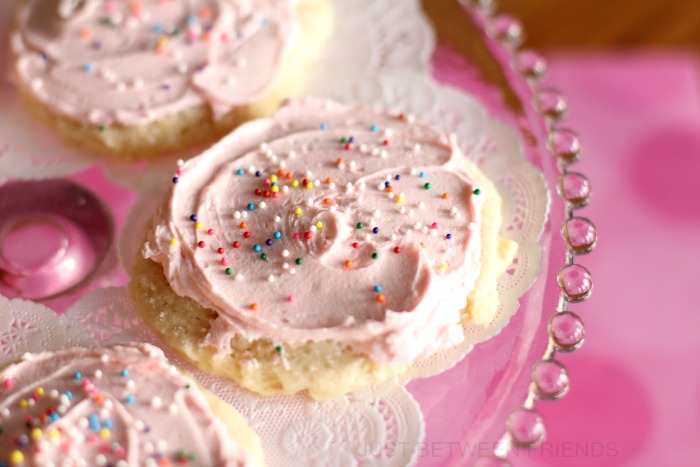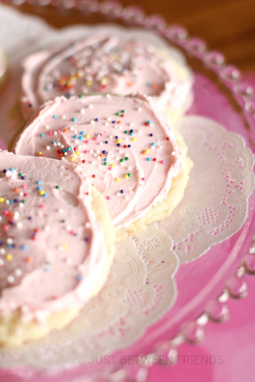 After you get them pressed and baked, make the frosting and add a couple of drops of red food coloring to get that pretty pink color. Add sprinkles and you are done! Eat those babies and thank my mom for sharing the recipe! (Hopefully I can talk her into sharing more over here!)