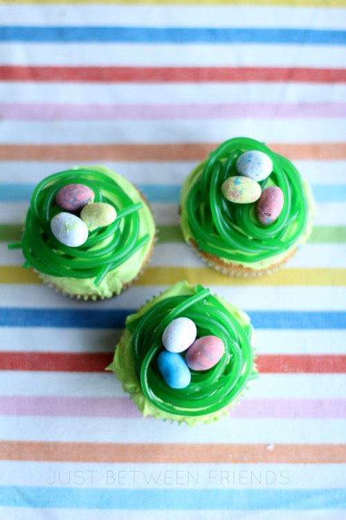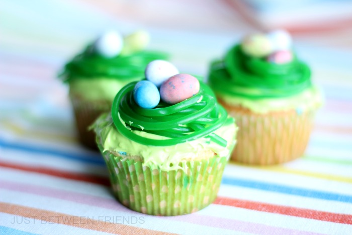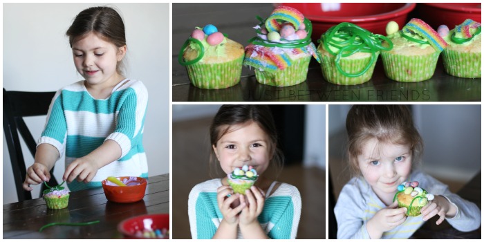 My three year old loves to help me in the kitchen. It is almost daily that she is asking me if she can help me cook dinner or if we can make cookies together. I was shopping at Target the other night and got the idea that I should make spring cupcakes with my girls when I saw the fun candy grass from Twizzlers. I grabbed all of the things I would need to make both some rainbow cupcakes as well as some birds nest cupcakes with my girls and headed home.