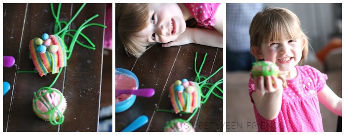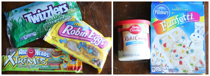 As a helpful tip, the airheads are in the dollar section, the twizzlers and robins eggs are in the easter section, and the cake mix and frosting are in the baking aisle at Target. Now go get some and try it out with your kids! You’ll be so glad that you did!