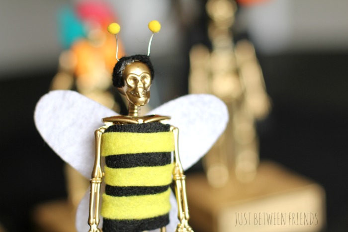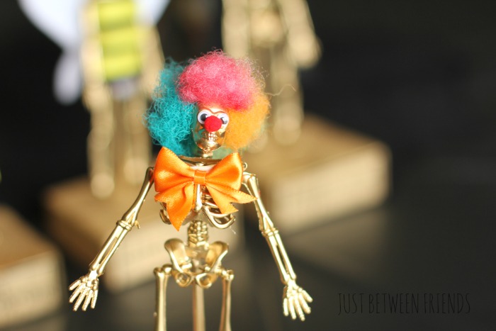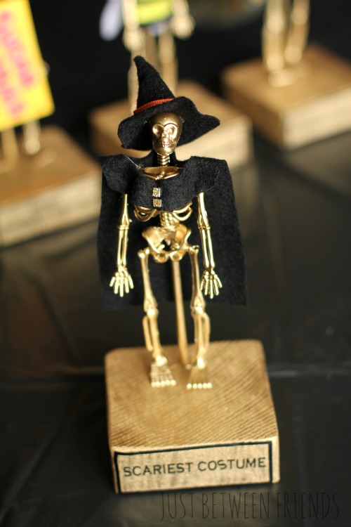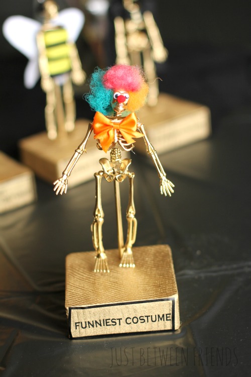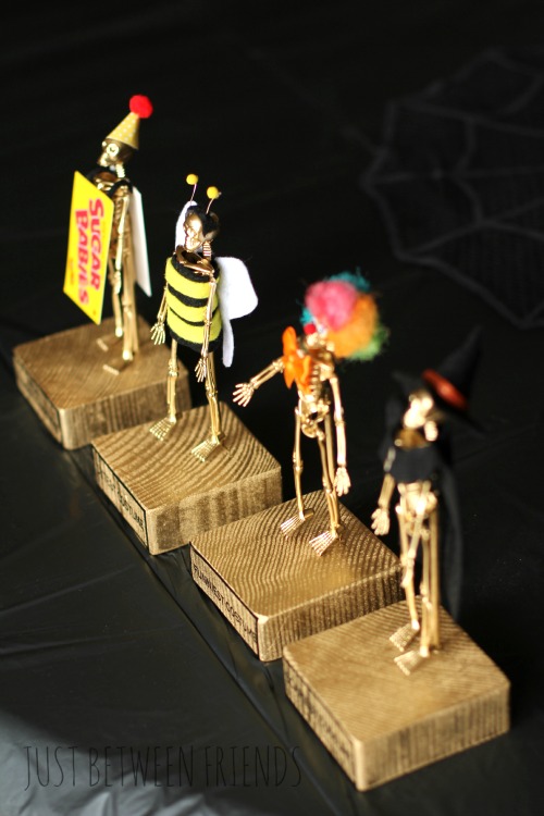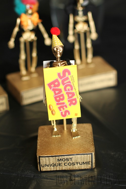 I loved some of the ideas that Ashley had in her tutorial, like the clown, bumble bee, and the milk duds, so I made my trophies similar to hers. Since the skeletons that I used were smaller, the milk duds wouldn’t work for me, so I went with Sugar Babies instead.