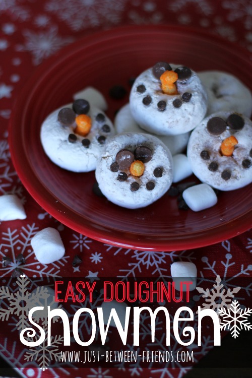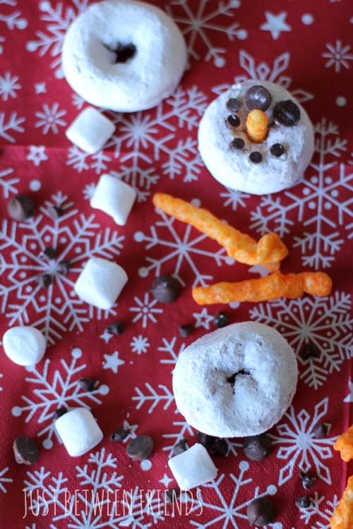 Are you enjoying all of the snowman posts? My girls and I have been having so much fun putting them all together for you! This is one of those posts that is so easy to do, but I think those are the ones that are my favorite since it is more realistic that it can be duplicated. If you want a way to make your kids giggle, give them cheetos, powdered doughnuts, and chocolate chips and tell them to make these easy snowman doughnuts. Not only will they love making them, they will love eating them too.
