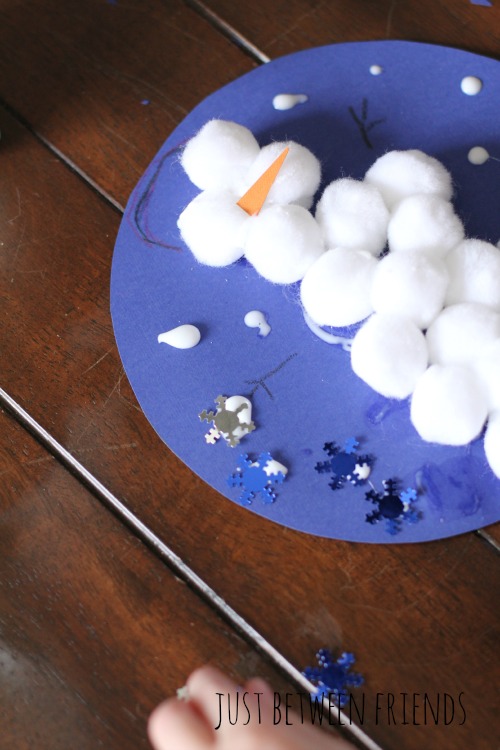 After the snowman was complete, we added snowflake sequins to the snowglobe to finish it off. I put dots of glue around the snowman, and then the girls put the snowflakes on the dots. It was a really fun touch to finish things off