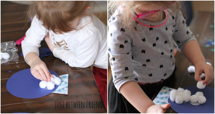 To get started, you’ll need blue cardstock, patterned cardstock in a coordinating or contrasting color, elmer’s glue, white pom poms, crayons, and snowflake sequins (optional. mine are from the Target dollar spot.) I began by tracing a circle onto the blue cardstock using a plate as a template. The kids plates from IKEA are the perfect size for this! Then I cut out some rectangles from the patterned paper and angled the sides slightly, then glued the two pieces together. Now it is ready for my kids to take over!